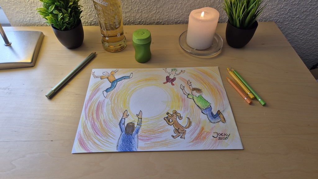Es gibt noch eine besondere Geschichte zu diesem Bild und der Postkarte dazu. Ich hatte ja erzählt, wie ich dieses Bild immer wieder gezeichnet und Leuten gegeben habe. Ein Grund, warum ich davon eine Postkarte haben drucken lassen, dass ich es nicht immer wieder neu drucken müsste und einfach die Karte weiter geben konnte.