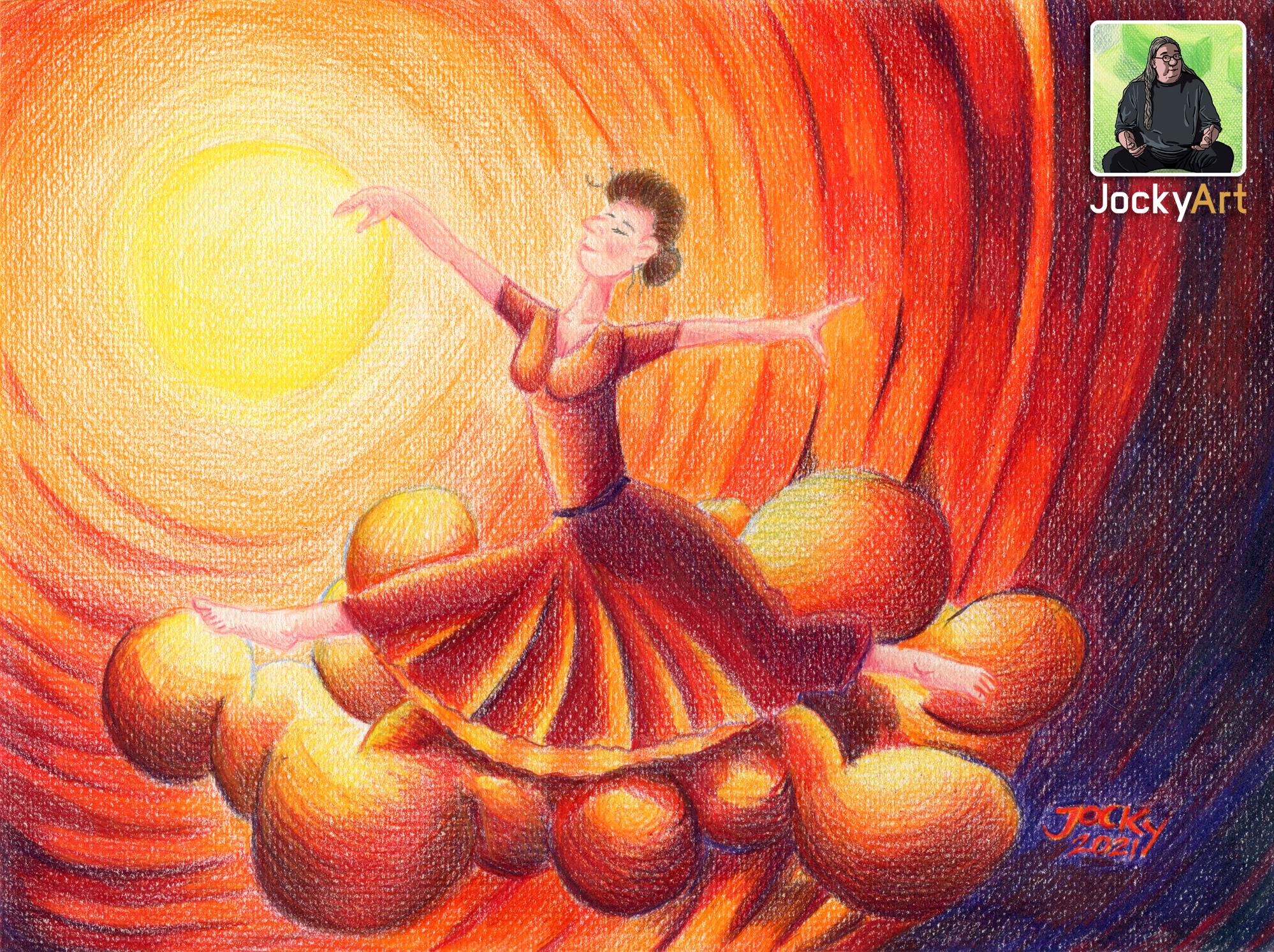 Jesus, ihr Geliebter, hüpft mit Leichtigkeit über die Berge und tanzt mit ihr über den Wolken.