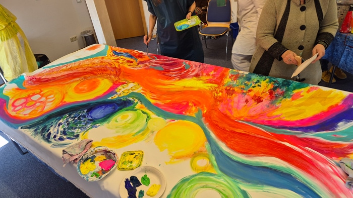 Am Samstagvormittag gab es verschiedene Happenings. Hier sind u.a. jeweils ganz besondere Kunstwerke entstanden, die die Teilnehmer zusammen erstellt haben. Ich war in dem Happening „Farbe“. Es war so spannend zu sehen, wie wir nach und nach gemeinsam die große Leinwand mit Farbe gefüllt haben. Jeder hatte so seinen ganz besonderen Beitrag, es hatte eine ganz bestimmte Dynamik, die auch nicht immer leicht war, wenn zum Beispiel jemand die eigenen Versuche anders weitergeführt oder sogar übermalt hat. Ich bin begeistert, was für ein stimmiges und farbenfrohes Bild dabei herausgekommen ist.