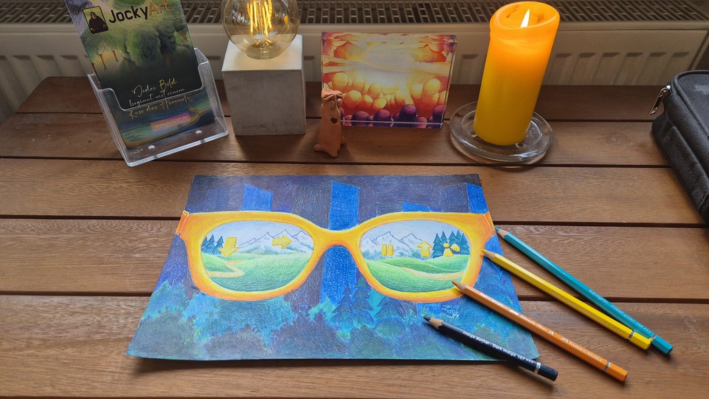 Kurz vorher durfte ich ein anderes Bild fertigstellen für Künstlerkollegen, den ich nur vom Internet kenne. Er hat sich auch sehr über das Bild gefreut. Er meinte, dass er sich schon länger eine neue Brille kaufen wollte und freute sich auch über die Elemente im Bild selbst. Sonst konnte er immer ein eigenes Bild für das bevorstehende Jahr malen, was er diesmal selbst nicht schaffen würde, daher war er sehr froh über mein Bild und war der Meinung, dass es ihn das Jahr über begleiten würde.
