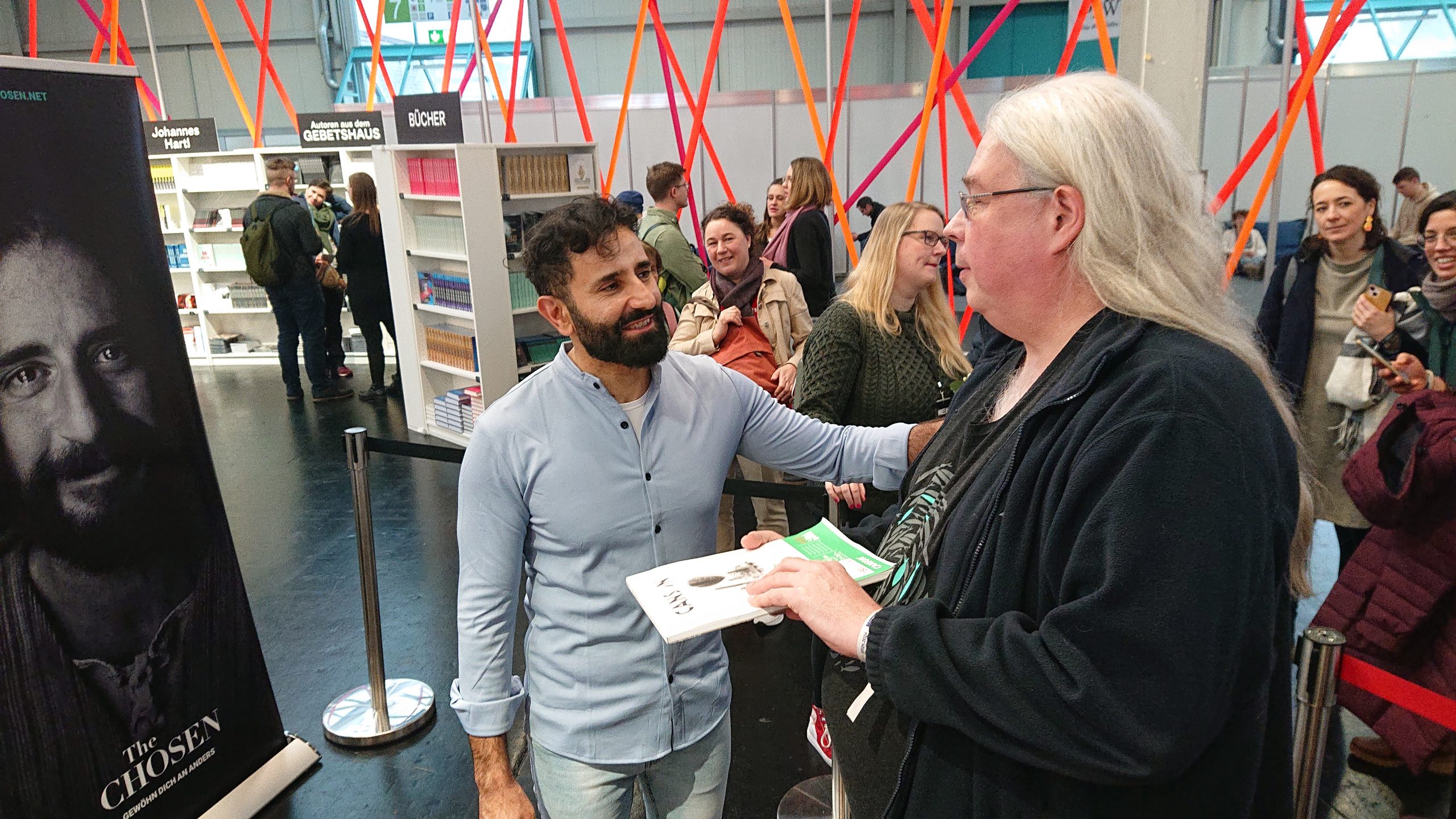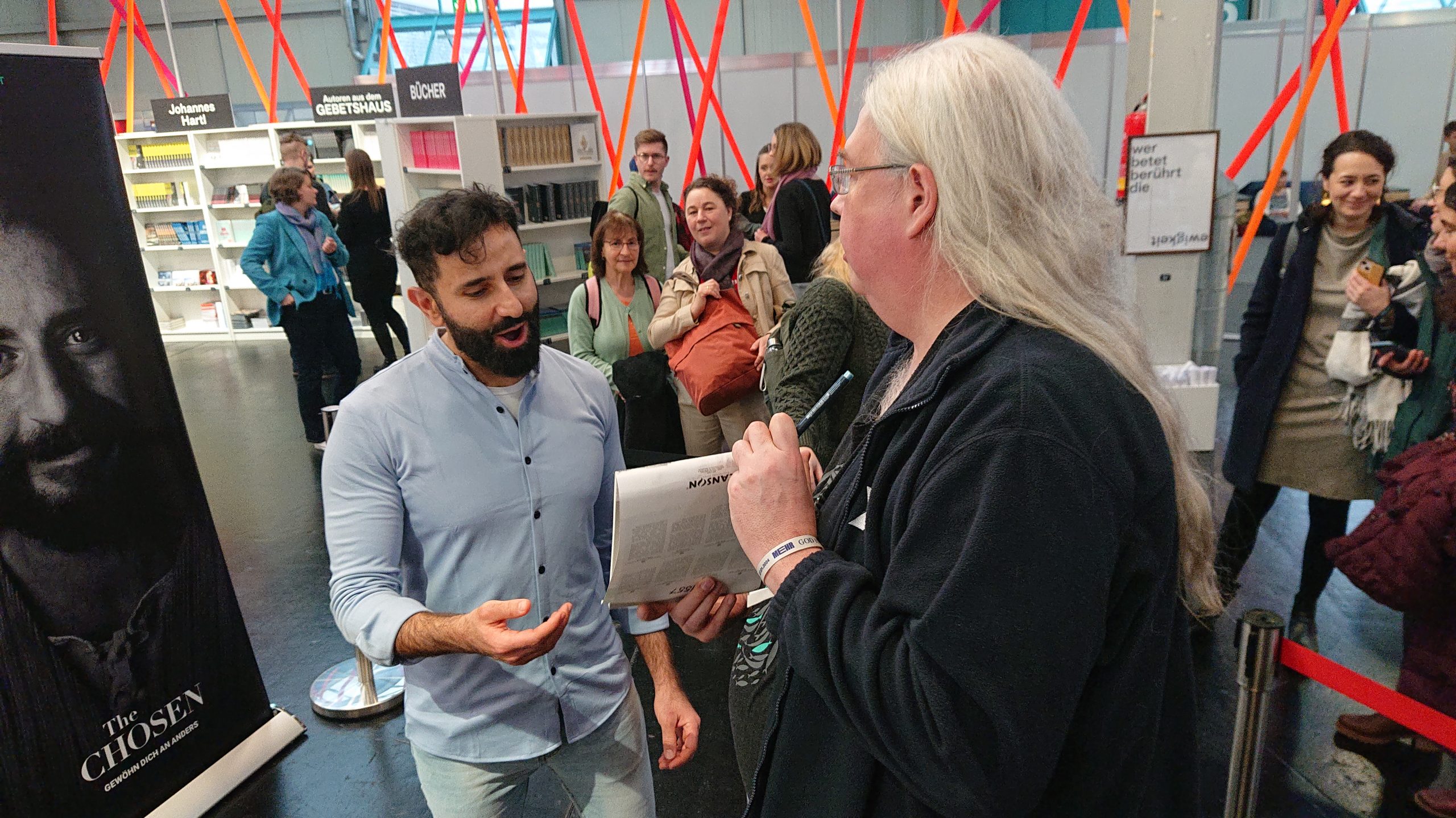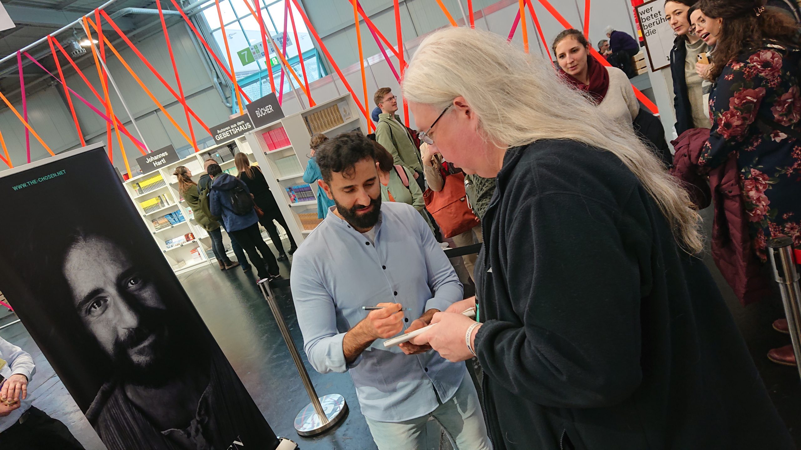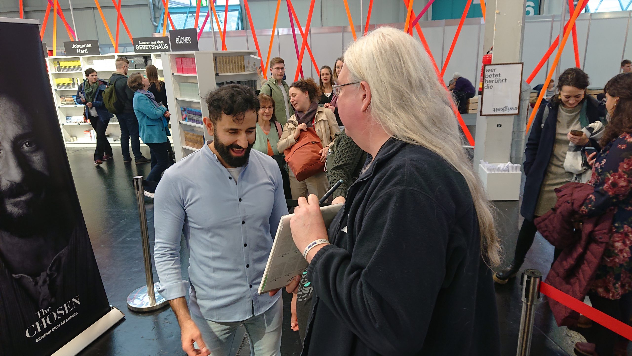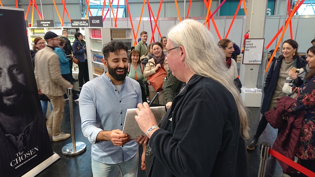 As a big fan of the series, I took the opportunity and traveled to Augsburg on this last day of the MEHR conference to meet actor Nick Shakour. I had created a cartoon of his character and brought it with me to get an autograph on it.