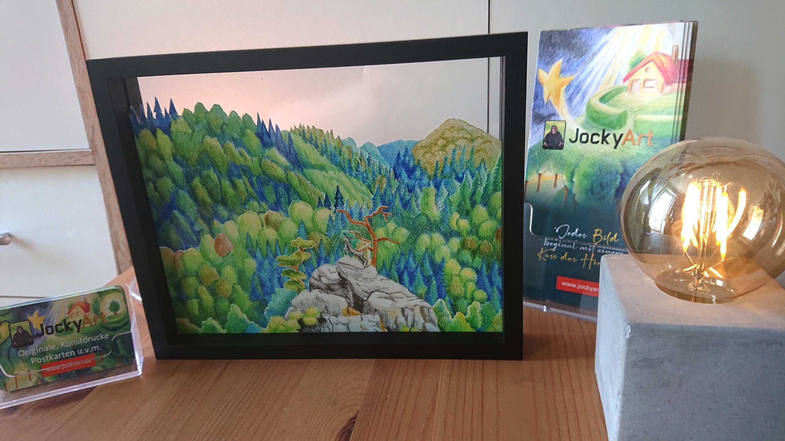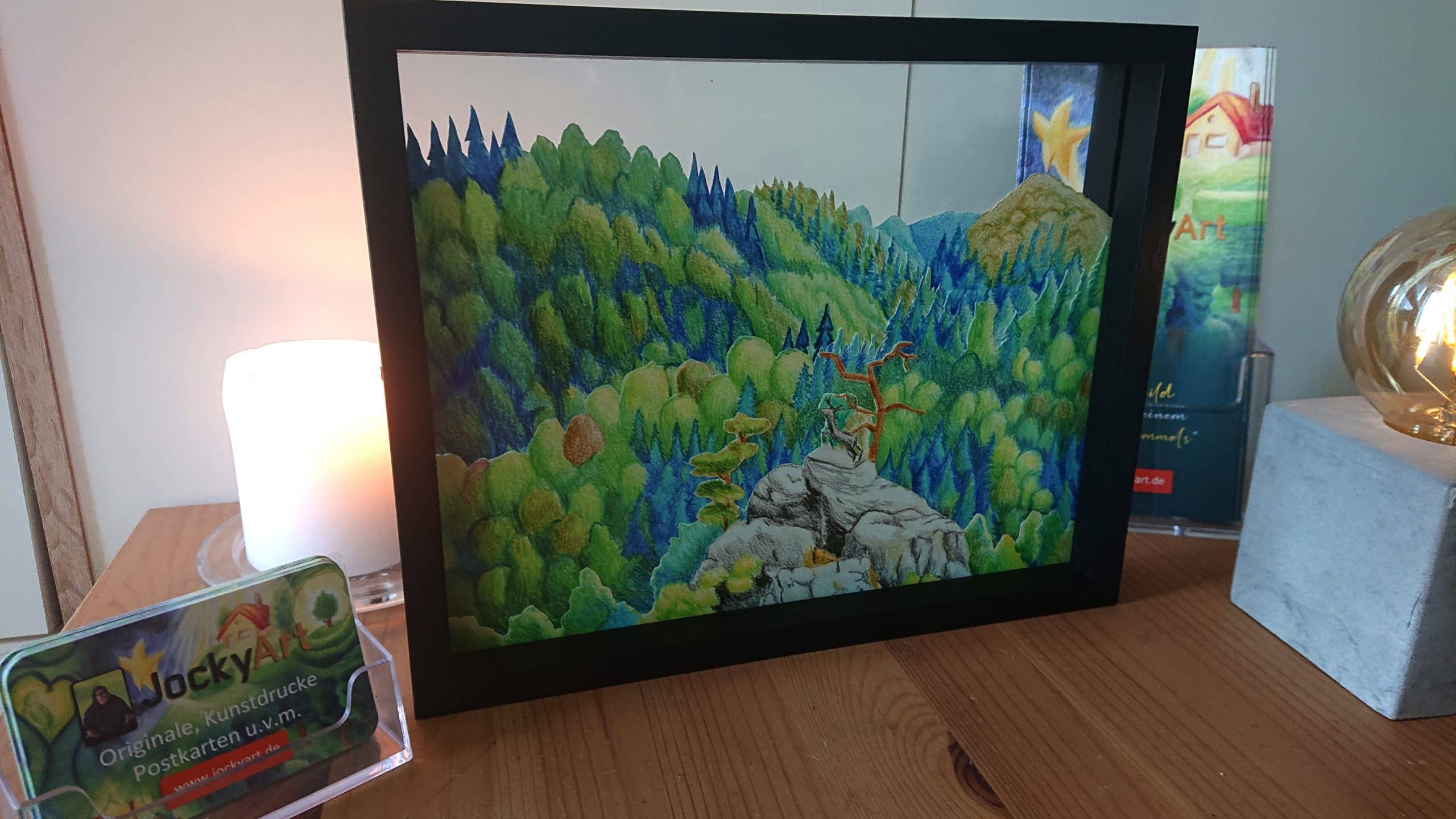 This 3D image consists of different levels that are individually designed with colored pencils and achieve a beautiful 3D effect. The sky is kept clear so that your own sky can shine through.