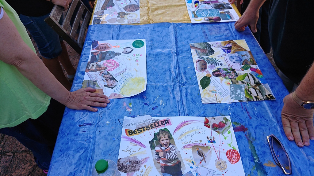 Here I would particularly like to highlight the prophetic collage that we created together one morning. We sat around a large table full of materials (magazines, cards, nice knick-knacks, paints, pens, glue and scissors), each with a blank white paper in front of us. Then we should stick something on it, draw or do something creative with it. Then the paper was passed on and the neighbors repeated the procedure. After 2 rounds, when everyone had their original sheet in front of them again, we were supposed to ask God whether he would give us a prophetic word for one of the collages. The words I received for mine touched me deeply. Over the next few days we prayed again and again for individuals and their collages.